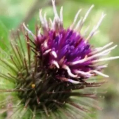 These biennial invasive plants were introduced into North America from Eurasia and can grow to three metres tall. They have highly branched stems ending in clusters of rounded purple flowerheads. Burdock has a large fleshy taproot.