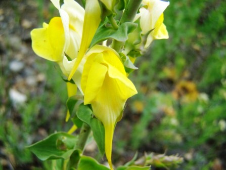 Dalmatian toadflax is a perennial forb with a large taproot, waxy, fleshy leaves, and a showy spike of bright yellow flowers.