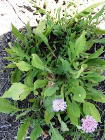 Field scabious is a large, erect forb with a large branched taproot and a single main stem, branching into multiple flower stalks.