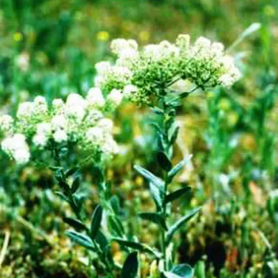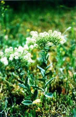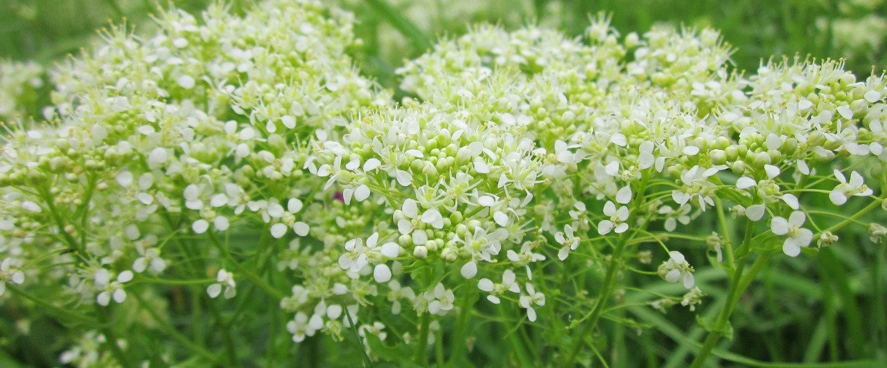 Hoary cress is a rooted perennial belonging to the Mustard family. It was introduced into North America in the 1800s, most likely in contaminated alfalfa seed (Kadrmas and Johnson, 2002). Hoary cress is also referred to as “white top” because of the numerous white flowers that are produced at the top of the plant (Ministry of Agriculture and Lands, 2002). Clasping, arrowhead-shaped leaves are present along the stem. The leaves are covered with soft white hairs giving them a gray-green color. Hoary cress can grow up to sixty centimetres tall.