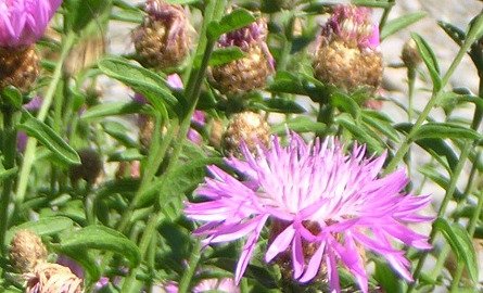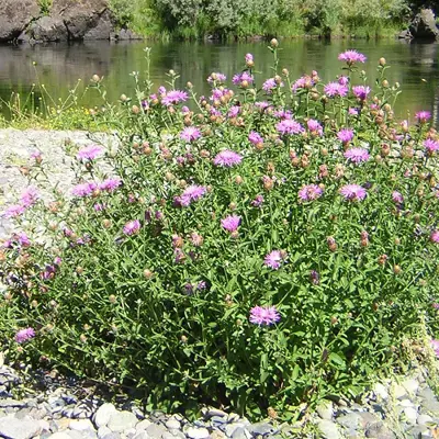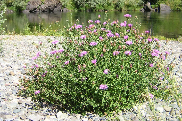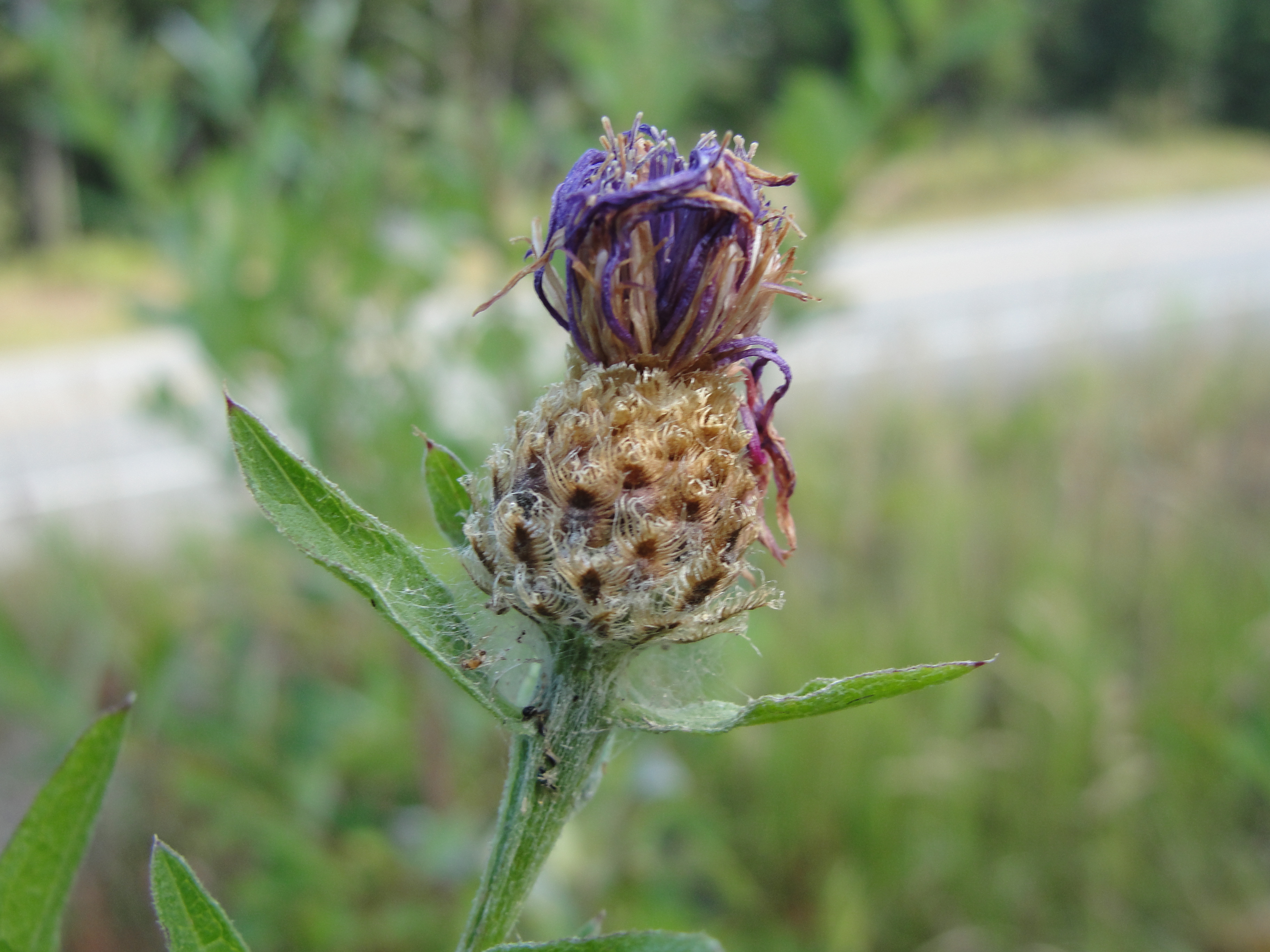 Meadow knapweed belongs to the Sunflower family. This plant is native to Europe and was thought to be introduced to North America as a contaminant in alfalfa seed (Ball et al 2006). Meadow knapweed can grow up to one metre tall. It has lance-shaped basal leaves. Several large purple-pink flower heads form at the top of its branched, hairy, erect stems. This species of knapweed is considered to be a hybrid between brown and black knapweed and is often confused with those knapweed species as well as Spotted knapweed. Meadow knapweed reproduces solely by seed (Ball et al 2006).