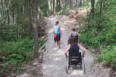 This trail starts at the north end of the picnic area of Kosta's Cove Community Park on popular 10 Mile Lake. The Community Park offers an accessible outhouse, picnic tables and a multi-purpose shelter for users' convenience and enjoyment. The trail travels northward along the lake into a forested area with rest areas including benches interspersed along the trail route. The trail features a gentle grade along the lakeshore while the trail section through the forest is of more significant difficulty, which may require assistance for some users.