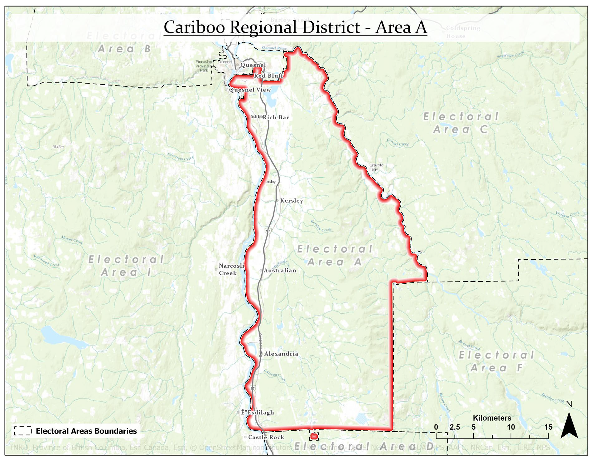 Just south of the City of Quesnel, Area A is centrally located within the Regional District with a significant population despite being the smallest electoral area. Rural communities in Area A include Red Bluff/Rich Bar which has about half of the area’s population; along with Kersley, Alexandria, and Dragon Lake. Land Area: 780 sq. km