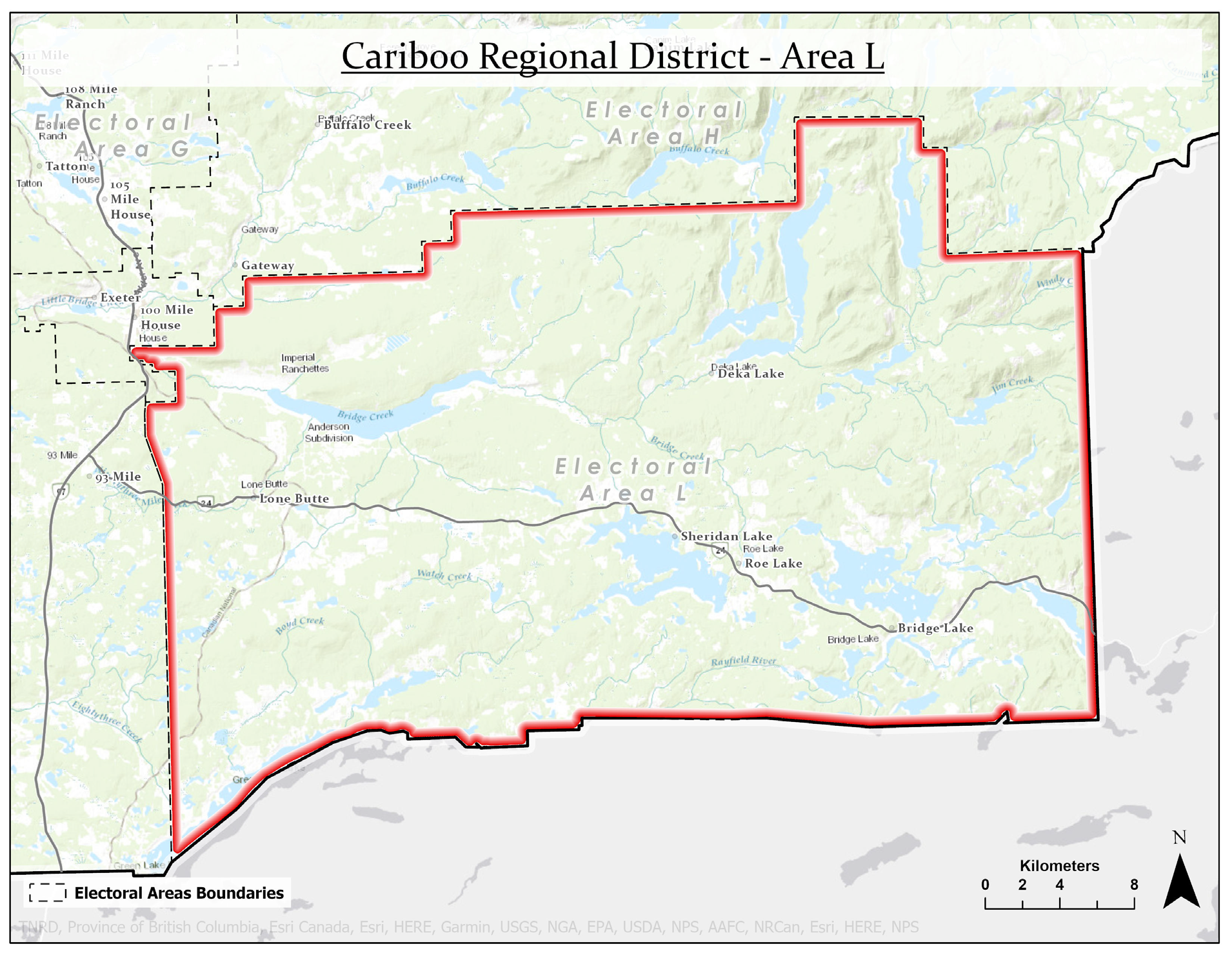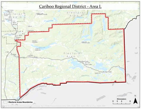 Area L is in the South-East corner of the Regional District. The major communities in this area include Deka Lake, Sheridan Lake, Roe Lake, Bridge Lake, Lone Butte, Horse Lake, Watch Lake, and the northern part of Green Lake. Land Area: 1,270 sq. km